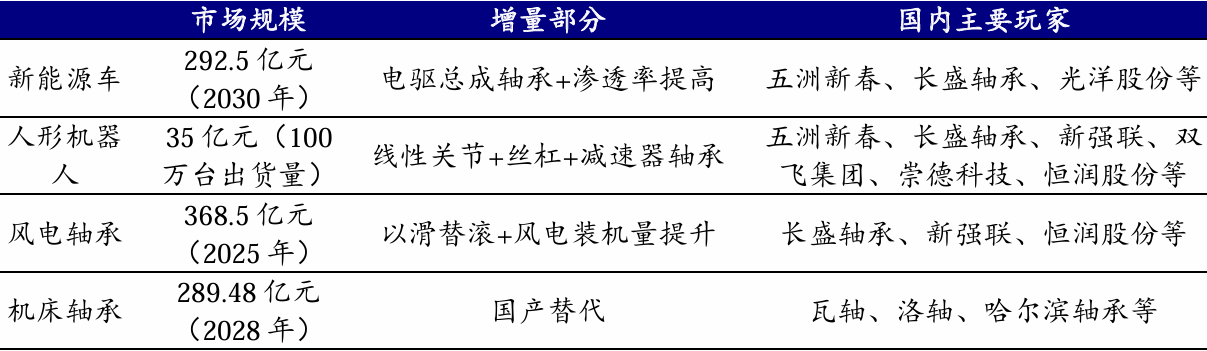 轴承作为机械设备基础零部件,行业景气度随制造业景气度波动。2022年,中国 市场规模为2500亿元,同比增长9.7%,下游汽车、人形机器人、风电、高端母机将带来广阔增量:(1)新能源车轴承:我国市场规模有望从 2022 年 108 亿元提升至2030年的293亿元;(2)人形机器人轴承:出货量为100万台预计对应轴承市场空间35亿元。(3)风电轴承:2025 年我国市场规模有望达到 368 亿元,其中风电滑动轴承37亿元;(4)机床轴承:2022-2028年全球机床轴承市场规模有望从231.51亿元提升至289亿元,CAGR为3.91%。大规模设备更新政策催化下,轴承作为工业设备核心运转部件,有望率先受益。