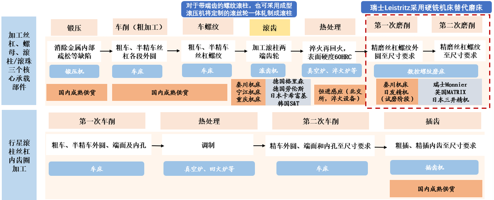 目前加工高端丝杠的设备被海外垄断,加工中高端丝杠的设备国内仅少数厂商 可供货,海外设备仍为主流。