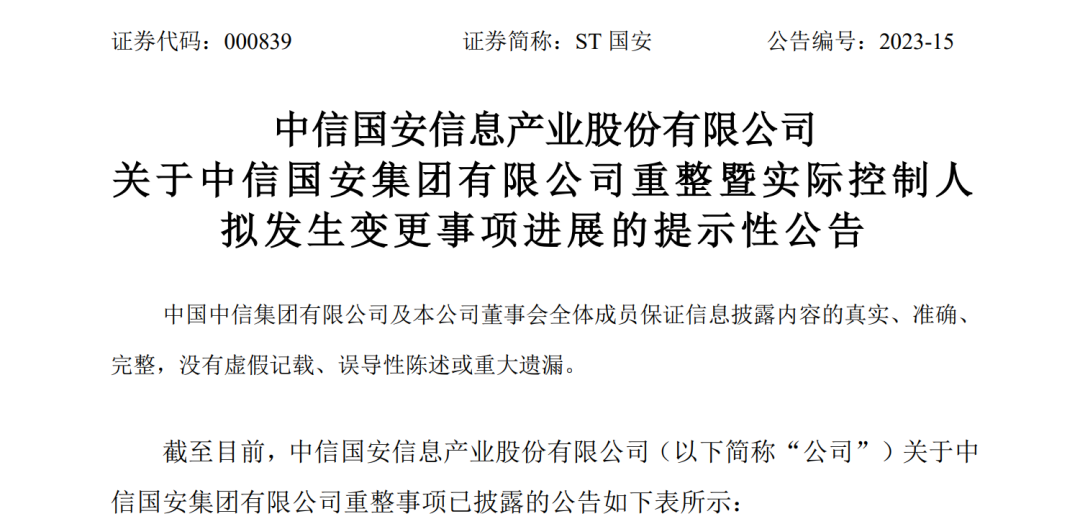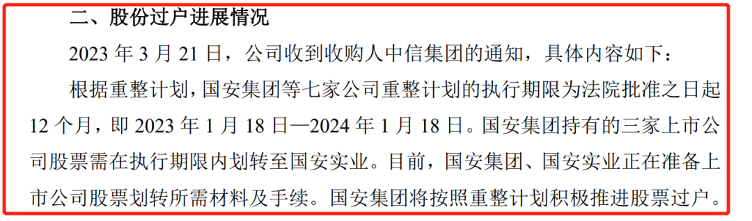 3月22日,ST国安披露了国安集团重整暨实控人拟发生变更事项进展公告。公告显示,3月9日,公司已收到收购人中信集团通知,根据重整计划,国安集团持有的三家上市公司股票需在执行期限内划转至国安实业。