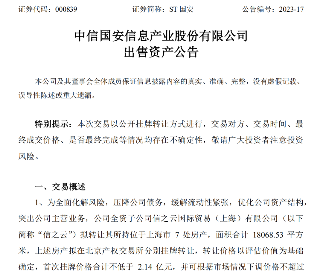 4月3日晚间,ST国安(000839)公告,为全面化解风险,压降公司债务,公司全资子公司信之云拟转让其所持位于上海市7处房产,面积合计18068.53平方米,上述房产拟在北京产权交易所分别挂牌转让,转让价格以评估价值为基础确定,首次挂牌价格合计不低于2.14亿元,并可根据市场情况下调价格不超过10%。