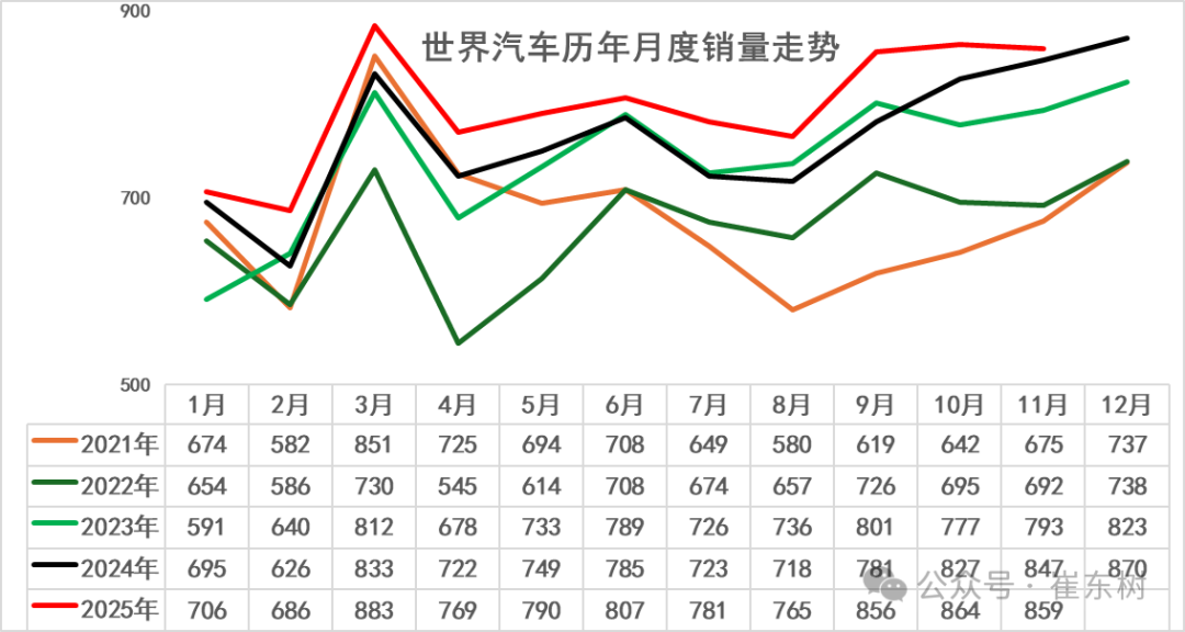 2025年11月的世界汽车销量达到859万台,同比增1%,环比10月增1%。随着中国和美国车市的相对放缓,2025年11月世界车市销量增长放缓。2025年1-11月销量8766万台,同比增长6%。