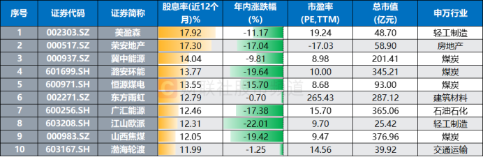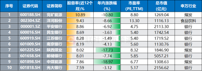 注:目前股息率(近12个月)数据居前的个股(截至4月11日收盘)