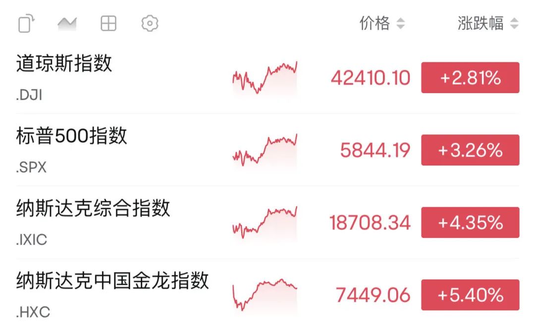 当地时间周一,美股三大股指集体上涨,纳指、标普指数均创3月以来收盘新高。截至收盘,道指涨2.81%,纳指涨4.35%,标普500指数涨3.26%。