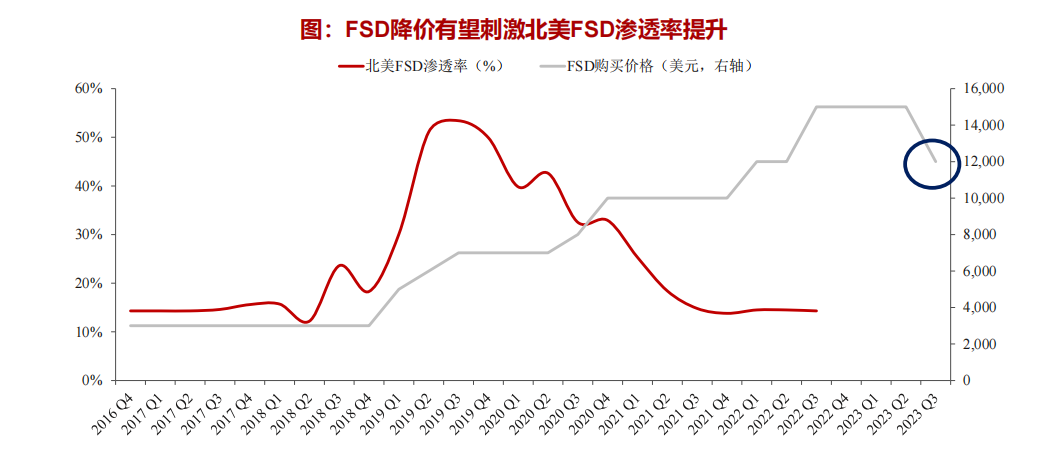 降价+V12加速推出有望助力FSD迎来爆发时刻。2023年9月FSD购买价格从15000美元降低至12000美元,有望刺激北美FSD渗透率提升。