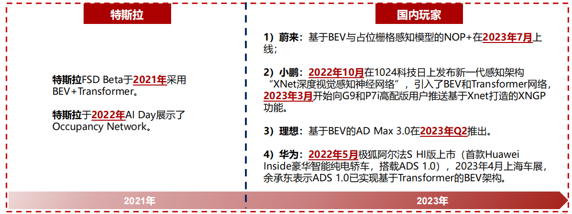 1)算法方面,特斯拉于2021年提出BEV+Transformer算法,22年提出Occupancy Network,算法领先国内头部玩家约2年。