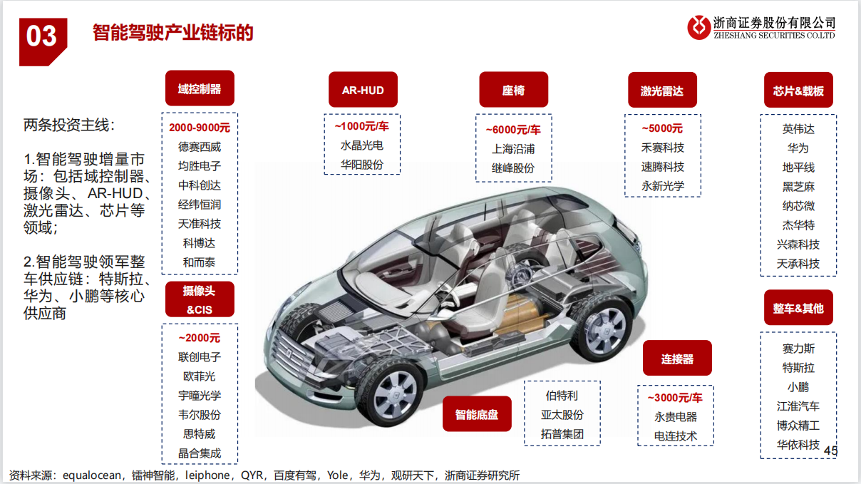 2)智能座舱:赛道推荐域控制器龙头公司经纬恒润,建议关注德赛西威、均胜电子和华阳集团,推荐座舱人机多模交互的华安鑫创、上声电子和科博达;