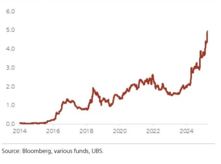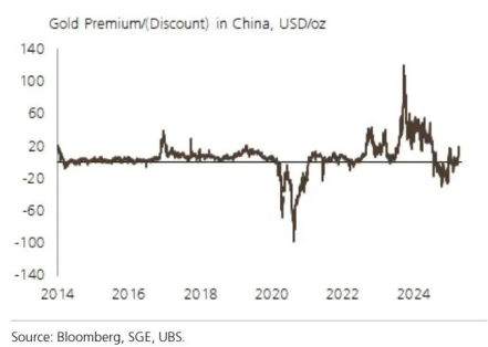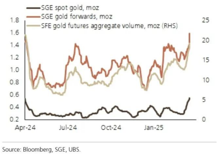 自 2024 年年中以来,中国黄金出口量一直低于平均水平,这表明国内市场在很大程度上处于去库存状态。然而,上海黄金交易所(SGE)国内溢价重新出现,且交易量上升,这可能表明需求强于预期,而供应受限。SGE 相对全球现货的溢价已升至 9 个月来的最高水平,因此一旦发放进口配额,可能会刺激进口。交易量也升至一年来的最高水平。虽然较高的金价可能抑制珠宝首饰需求,但投资需求似乎比瑞银预期的更能弥补这一缺口。中国投资驱动的实物需求可能会进一步加剧流动性问题,使价格波动更加剧烈。