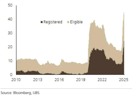 图 3:纽约商品交易所(Comex)合规黄金库存自 11 月以来增加了约 1100 万盎司,可能会率先流出