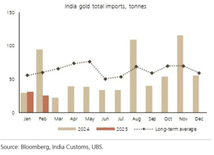 图 5:印度黄金进口量低于平均水平,但鉴于价格下跌和即将到来的季节性需求,情况可能改善