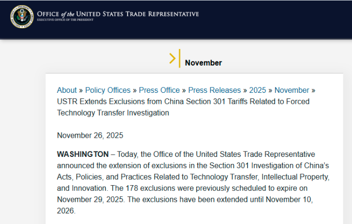 美国贸易代表办公室当地时间11月26日宣布,将把针对中国技术转让和知识产权问题、依据301条款调查所设立的关税的豁免延长至2026年11月10日。现有豁免条款原定于今年的11月29日到期。