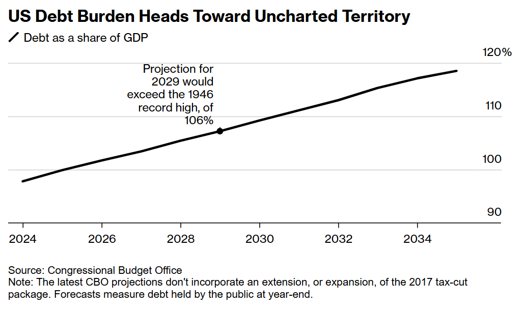 参议院多数党领袖约翰·图恩定下6月攻坚时间表,但强调最终法案必须"实质性削减支出"。无党派国会预算办公室此前预警,即便没有新税改,2029年债务/GDP比也将创历史新高。穆迪在降级声明中直言,美国经济实力"难以抵消财政指标恶化"。
