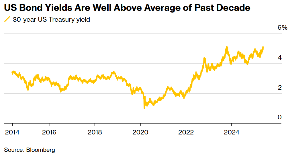 值得注意的是,30年期美债收益率周三再度突破5%心理关口,为特朗普的财政扩张计划浇下冷水。然而,这并非孤立事件:上周穆迪投资者服务公司宣布将美国主权信用评级从Aaa级除名,成为两年内第三家下调美国评级的机构。该机构预警,未来十年美国债务占GDP比重将从当前约100%激增至134%,远超特朗普3月承诺的"短期平衡预算"目标。