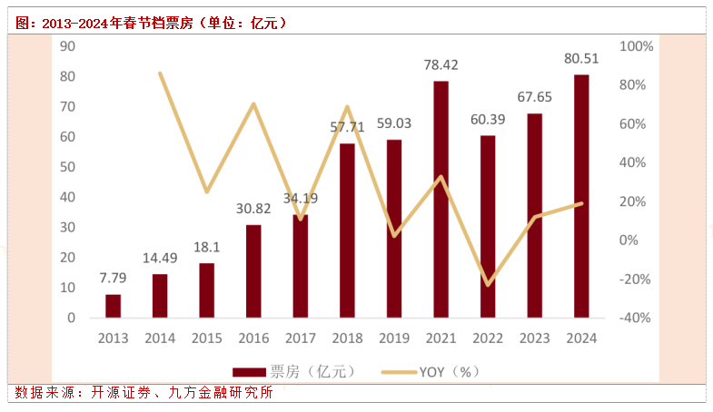 2013年至2019年,全国票房从218亿元增长至641.48亿元,年复合增长率超过20%。特别是春节档,逐渐成为最重要的票房来源之一,2019 年春节档票房达到59亿元,代表作如《流浪地球》等创造了票房奇迹。2020 年,受新冠疫情影响,全国票房骤降至203亿元,春节档电影全部撤档。2024年,春节档票房再次突破80亿元,观影人次达到1.63亿,显示出强劲的复苏势头。、