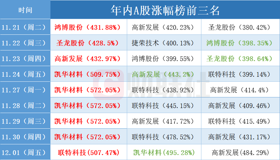 主营环氧塑封料的凯华材料,周一盘中触及30CM涨停一度实现7天6板,截至收盘累计涨幅为572.05%。继上周五收盘赶超此前第一的高新发展后,蝉联年内A股“涨幅王”。值得注意的是,时隔仅一天高新发展上周四收盘赶超圣龙股份成为A股年内涨幅王,同样时隔仅一天圣龙股份上周三收盘超越鸿博股份成为A股年内涨幅王,年内A股涨幅王宝座可谓是频繁更迭。