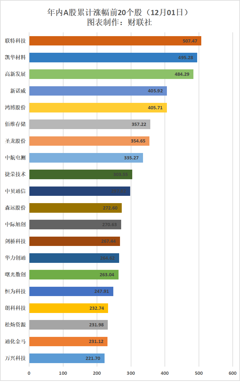 排名第三至第十的个股分别为高新发展、新诺威、鸿博股份、佰维存储、圣龙股份、中航电测、捷荣技术、中贝通信,涨幅在295%485%之间。排名第十一至第二十的个股分别为森远股份、中际旭创、剑桥科技、华力创通、曙光数创、恒为科技、朗科科技、松炀资源、通化金马和万兴科技,涨幅在220%-275%之间。