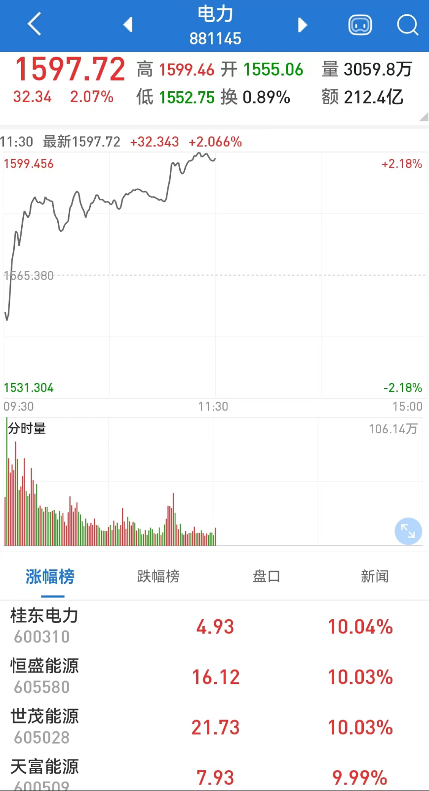 电力股早盘强势上攻,板块指数涨逾2%,创年内新高,半日成交接近前一交易日全天成交。桂东电力低开高走,直线拉涨停,近9个交易日,六度涨停,累计大涨55%;天富能源开盘后不到5分钟直线涨停,股价创1年半多来新高;建投能源等亦强势涨停。
