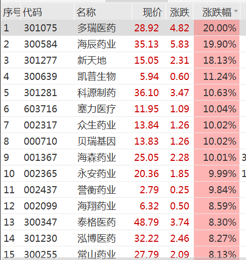 在恒瑞医药港股上市首日大涨的刺激下,A股医药板块爆发。截至午间收盘,多瑞医药20%涨停,海辰药业一度20%涨停,新天地、科源制药等上涨超10%,众生药业、贝瑞基因、海森药业等多股涨停。