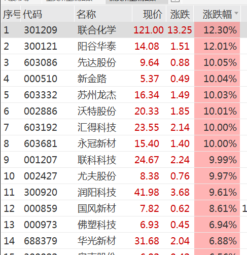 近期化工板块持续活跃,多股呈现翻倍走势。截至午间收盘,联合化学、阳谷华泰涨超12%,先达股份、新金路、苏州龙杰等多股涨停。