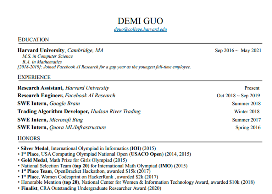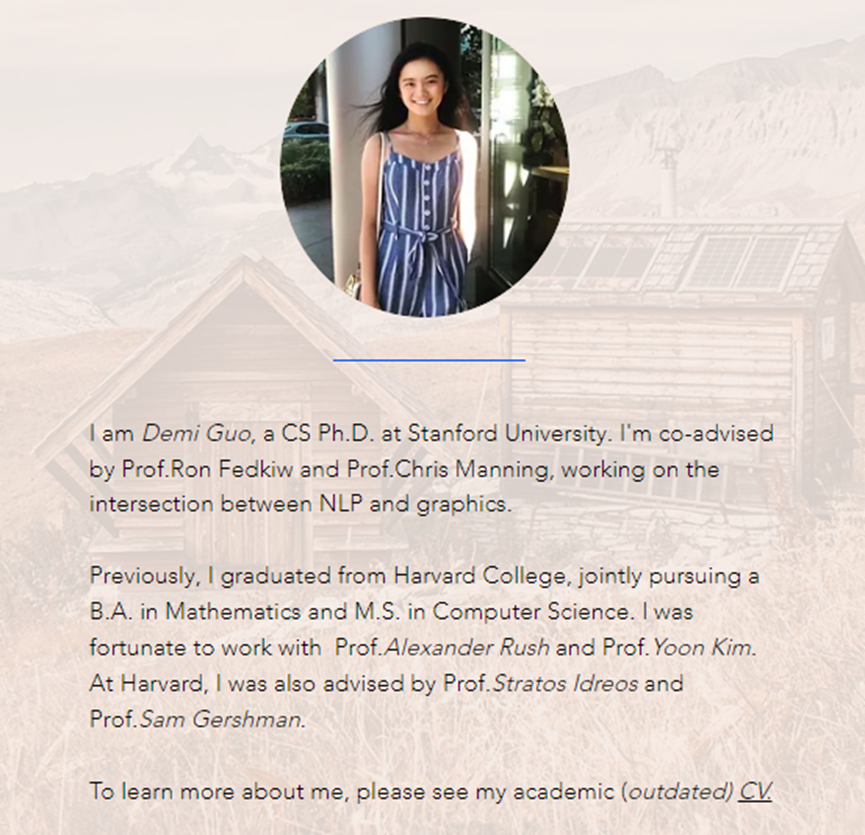翻开郭文景的履历,她从哈佛获得数学学士学位和计算机科学硕士学位后,继续攻读斯坦福大学计算机博士学位,专攻NLP(自然语言处理)和图形学。上学期间,郭文景先后在MetaAIResearch、微软、谷歌大脑(GoogleBrain)、EpicGames等公司和团队实习。