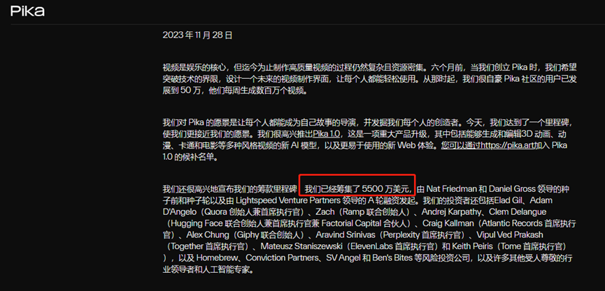 Pika于当地时间11月28日发文称,公司累计融资5500万美元。