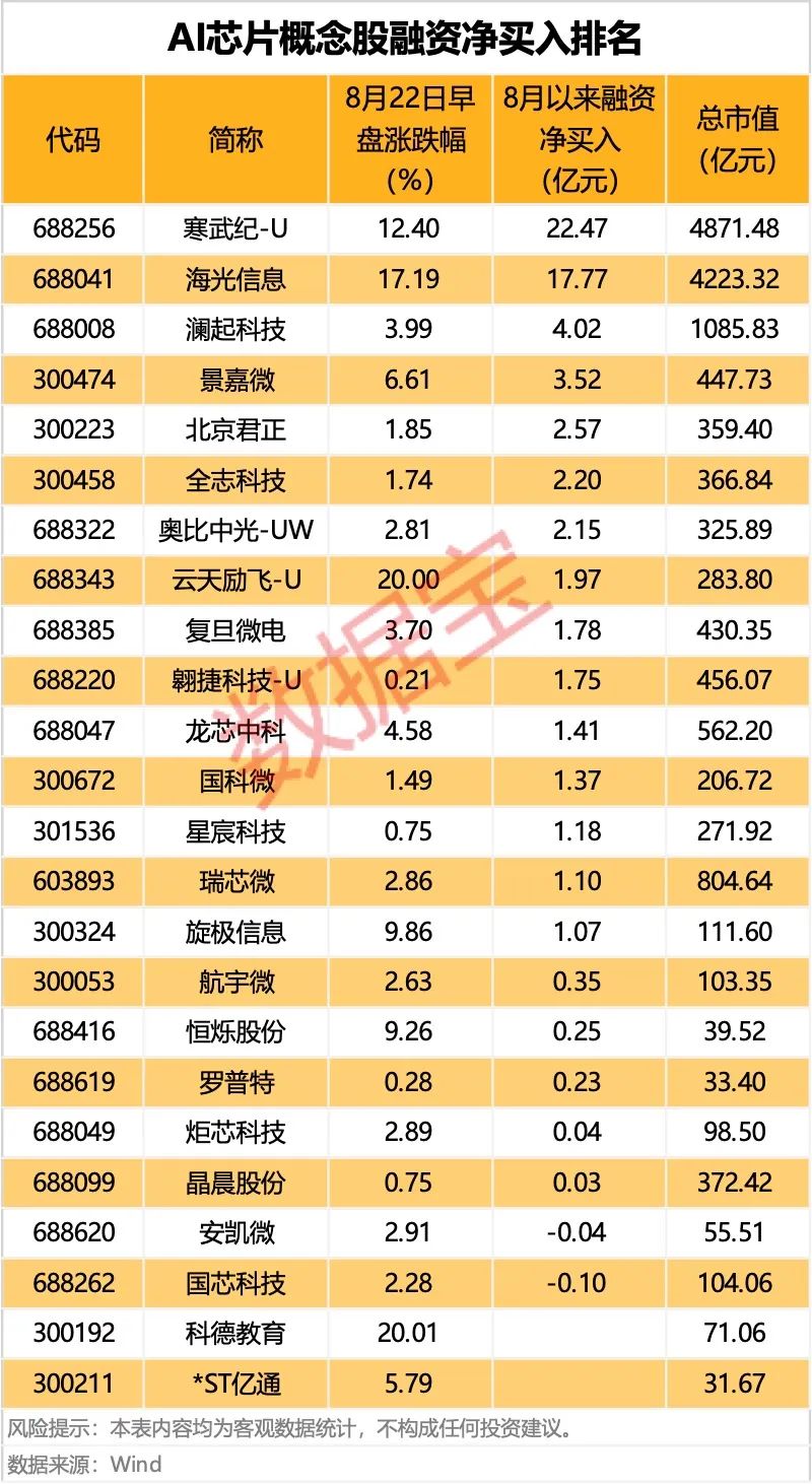 从资金面上来看,AI算力概念股备受杠杆资金青睐,8月以来合计净买入67.09亿元,寒武纪-U、海光信息、澜起科技净买入金额居前,分别达到22.47亿元、17.77亿元、4.02亿元。