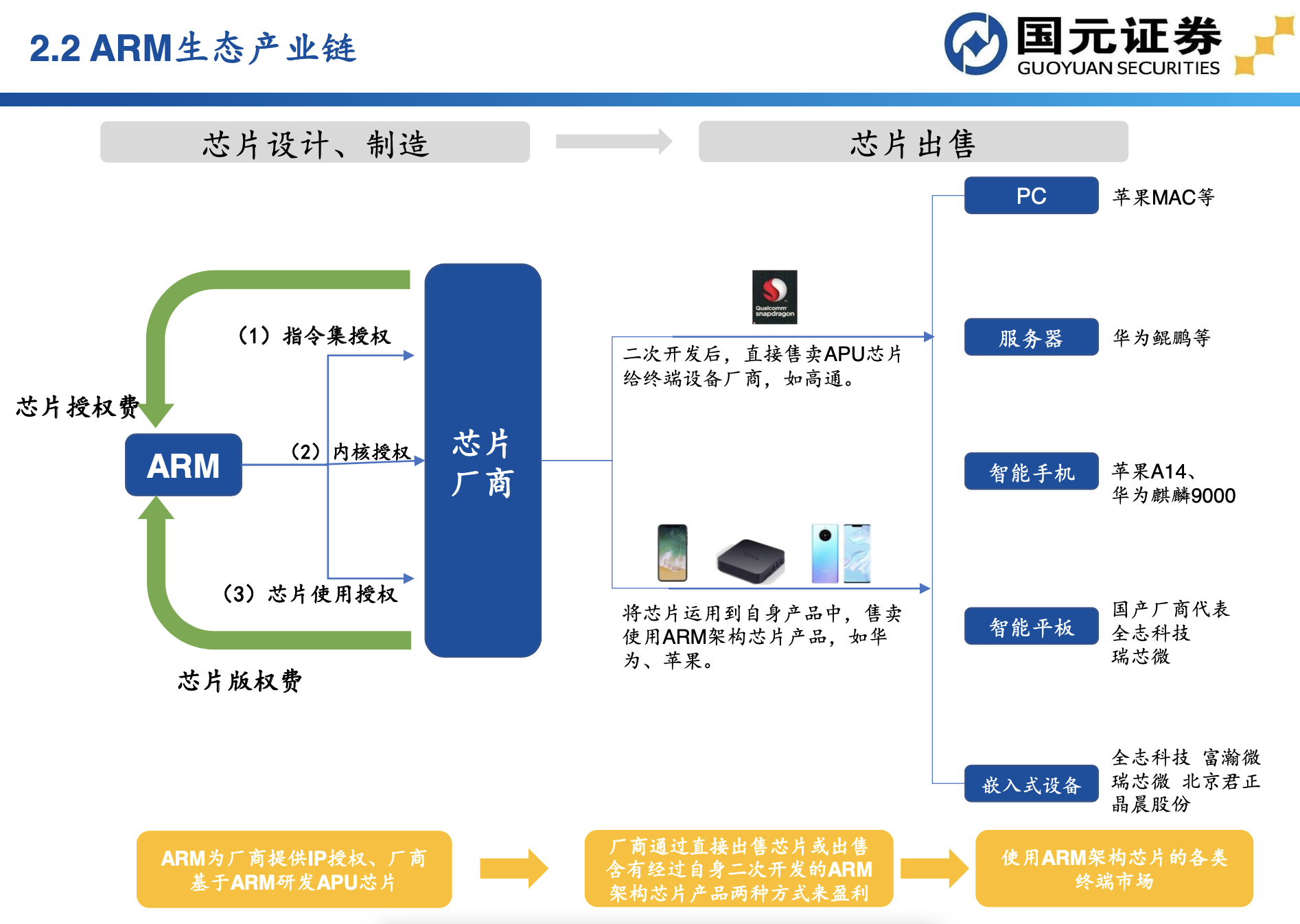 国元证券贺茂飞在研报中指出,ARM生态产业链中,ARM通过其独特的授权模式已吸引众多APU生产厂商,如手机APU厂商苹果、高通,据悉,英伟达的GH200里CPU则采用了ARM架构,iPhone15Pro搭载的A17Pro为全球首颗台积电3nm制程的ARM架构SoC芯片。此外,国产应用处理器(APU)厂商全志科技、瑞芯微、晶晨股份、富瀚微、国科微以及北京君正等,龙头全志、晶晨有望助力ARM在未来完善IoT应用领域生态建设。