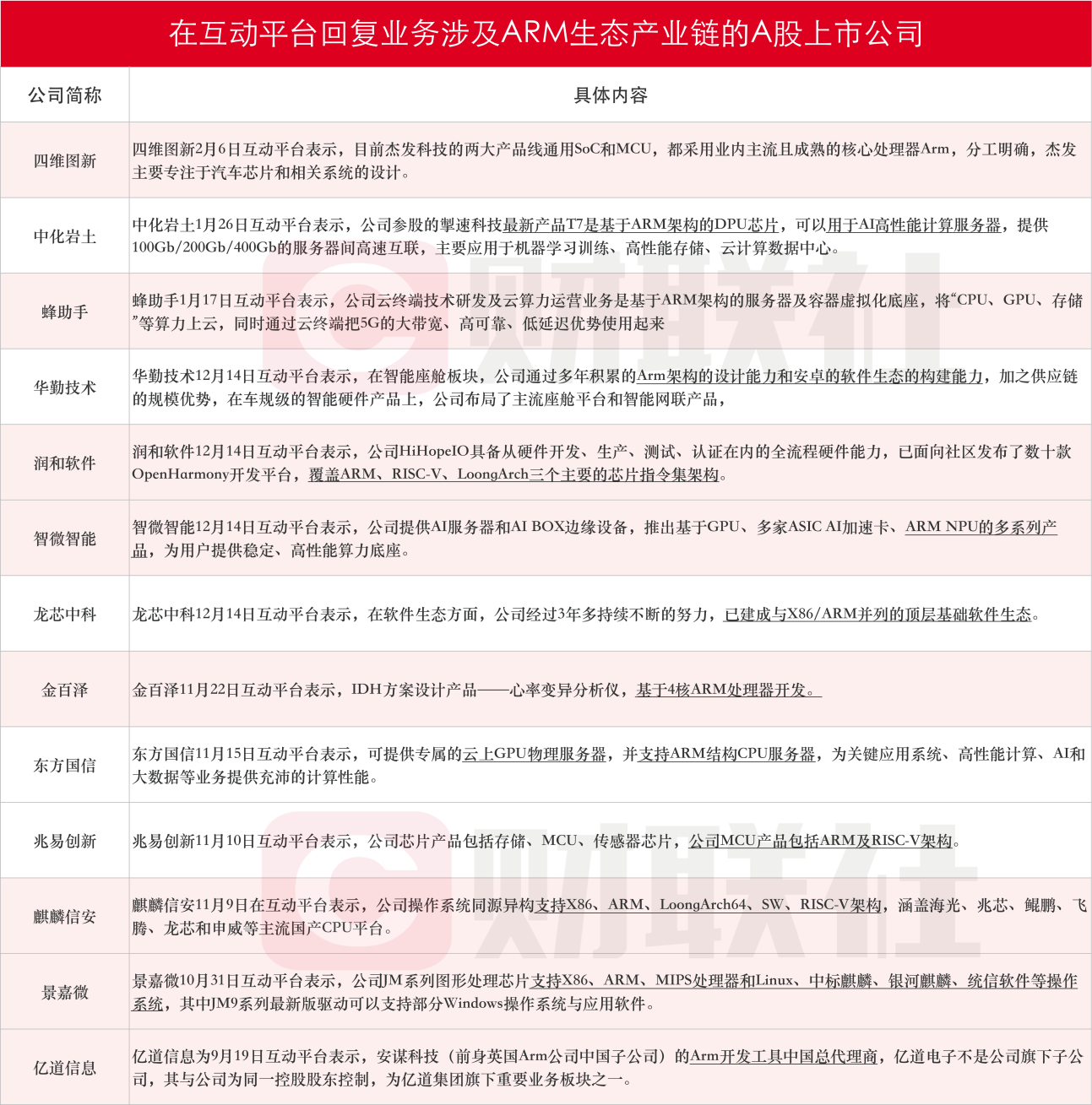 据财联社不完全统计,包括四维图新、中化岩土、蜂助手、华勤技术、润和软件、智微智能、龙芯中科、金百泽、东方国信、兆易创新、麒麟信安、景嘉微及亿道信息在内的多家A股上市公司在互动平台回复业务涉及ARM生态产业链,具体情况如下图: