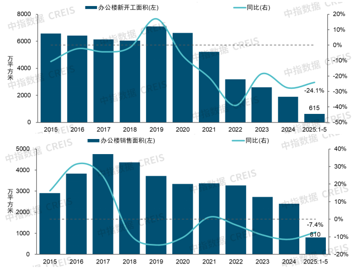 图:2015-2025年1-5月全国办公楼新开工及销售面积走势