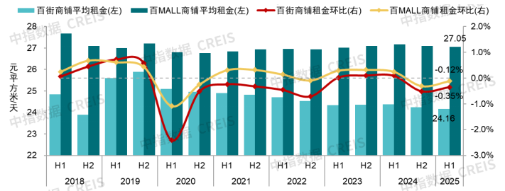 根据对全国重点城市主要商业街和典型购物中心商铺租赁样本的调查数据,2025上半年,由全国重点城市100条商业街商铺为样本标的构成的百大商业街(百街)商铺平均租金为24.16元/平方米/天,环比下跌0.35%,跌幅较2024下半年收窄0.16个百分点;由100个典型购物中心商铺为样本标的构成的百大购物中心(百MALL)商铺平均租金为27.05元/平方米/天,环比下跌0.12%,跌幅较2024下半年收窄0.19个百分点。