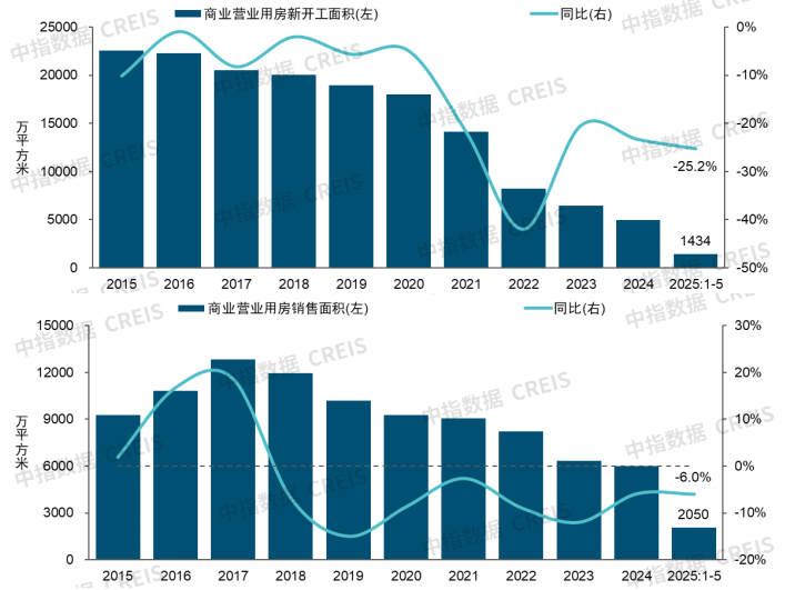 图:2015-2025年1-5月全国商业营业用房新开工及销售面积走势