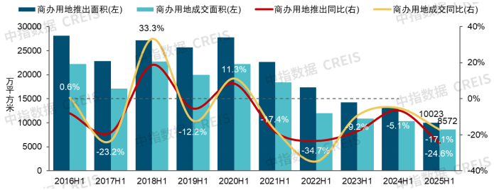 图:2016年上半年-2025年上半年全国300城纯商办用地推出及成交面积走势