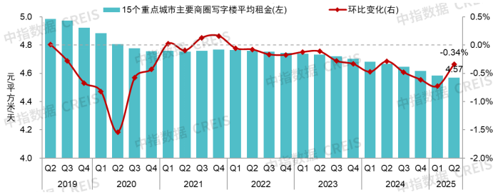 图:2019-2025年全国重点城市主要商圈写字楼平均租金及环比变化