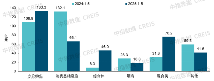 分物业类型来看,优质零售商业及办公物业仍最受青睐。从交易宗数来看,2025年1-5月,以商业地产(商业、办公楼、酒店、综合体)为标的的交易宗数共51宗,占比61%。以披露金额的交易计算,零售商业交易金额相对较高,为555亿元,占比60%,办公楼交易金额为235亿元,占比25%,综合体、酒店交易金额合计约30亿元,合计占比3%,工业类标的、租赁住房及产业园区交易金额合计约112亿元,合计占比12%。