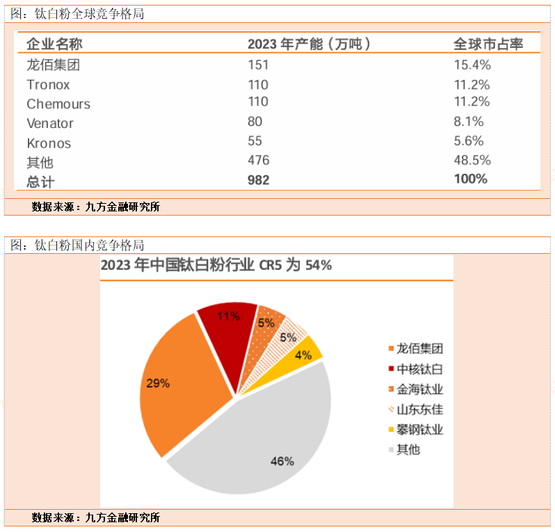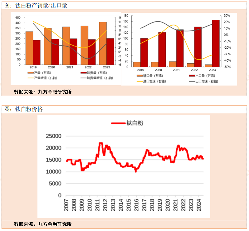 中国是全球钛白粉最大的生产基地,也是最大的出口国。2023年全球钛白粉产能在981.9 万吨,产能增长主要为中国,目前中国产能占全球产能55%;受国际市场需求及钛白市场 行业运行情况影响,科慕、泛能拓部分产能退出,中国钛白产能份额继续逐步扩大。2023 年全球前五大钛白粉企业为龙佰集团/特诺/科慕/泛能拓/康诺斯,全球CR5为51.5%。钛白粉行业格局很好,属于寡头垄断格局。龙佰集团一家独大,市场份额高达46%(国内),这也造就了钛白粉价格景气度要远好于其他地产化工品。2023 年我国钛白粉产量407万吨,同比增长9.9%;消费量为251.3万吨,同比增长3.8%。我国约30%-40%的钛白粉生产用于出口,2023年我国钛白粉出口164.2万吨,同比+17%。钛白粉下游需求以涂料为主,2023年占比达到58%,塑料与造纸占比分别为24%/10%。
