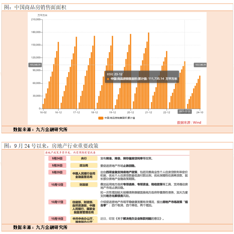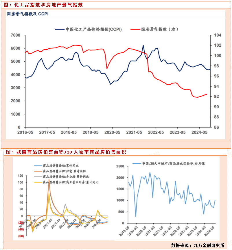 房地产行业作为化工重要的终端下游,承载着较大的消费体量。房地产行业景气度的变化,对地产相关化工品景气度影响巨大。一般化工品价格周期滞后竣工周期约一年。随着今年9月底以来,国家不断的房地产政策刺激,我们判断房地产销售数据会逐步好转,从而带动上游地产化工行业景气度开始景气回升。
