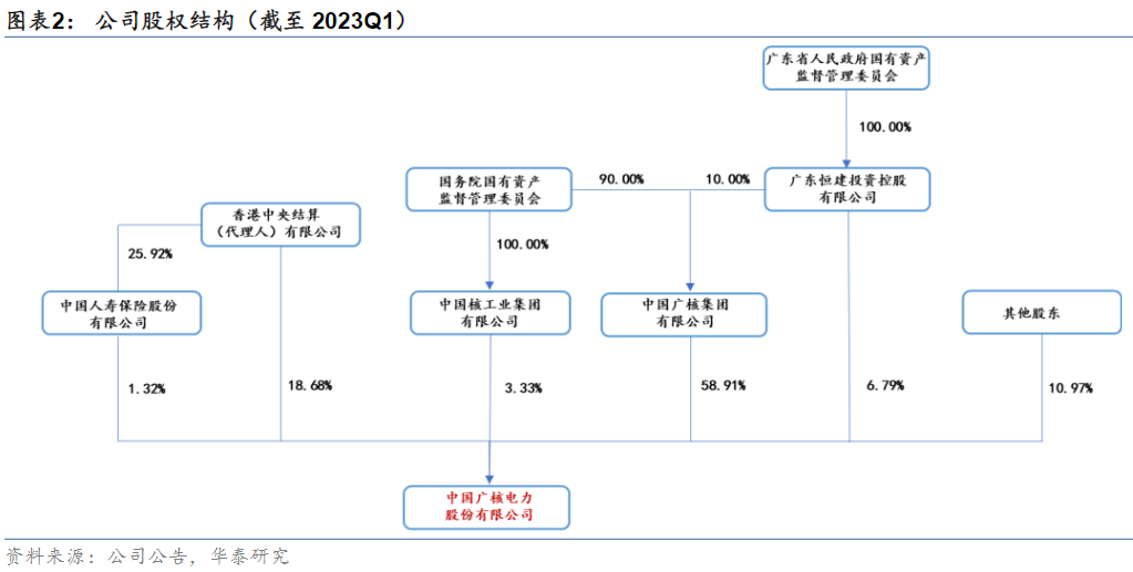 公司控股股东为中国广核集团,是由国务院国资委监管的大型清洁能源中央企业,持股比例为58.91%,剩余主要股东为香港中央结算有限公司,恒健投资—广东省国资委持股100%,以及中国核工业集团—国资委持股100%,持股比例分别为18.68%、6.79%、3.33%。