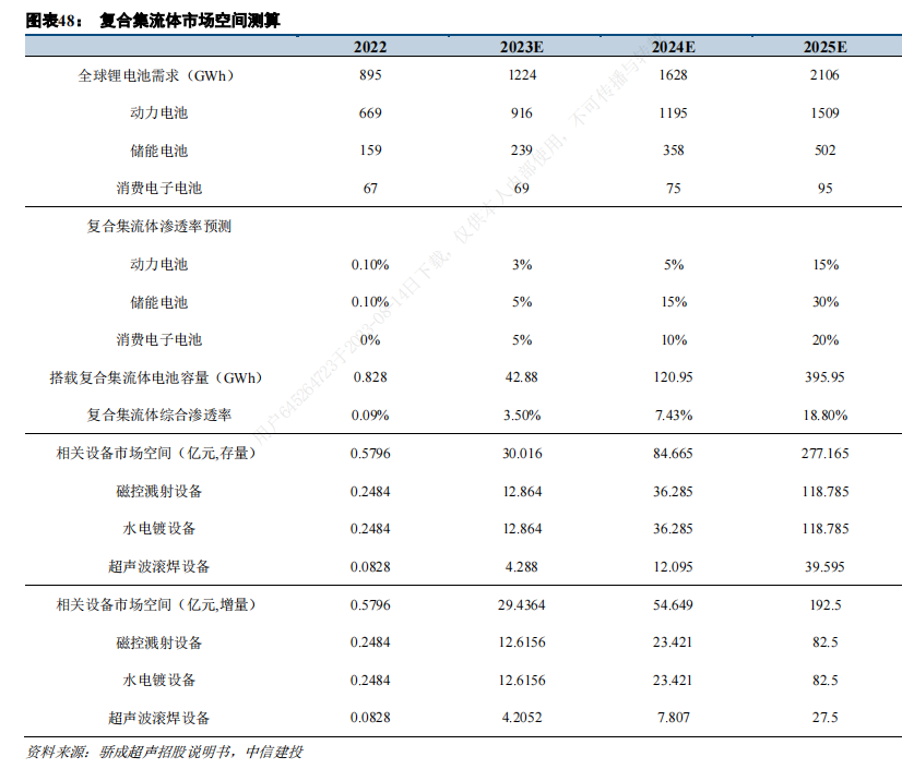 在全球新能源汽车、储能等行业稳健成长的前提条件下,预计到2025年,动力、储能、消费电子锂电池中复合集流体渗透率将分别达到15%/30%/20%,综合渗透率将达到18.80%。在复合集流体替代传统集流体的过程中,工艺技术和生产设备为核心壁垒,机构认为设备厂商作为关键环节将率先受益。