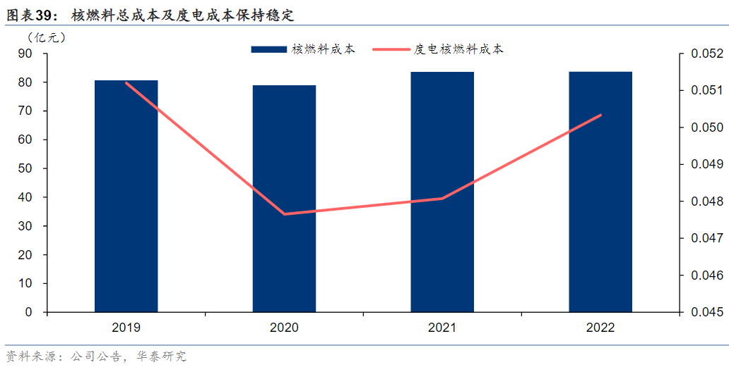 核燃料成本是公司经营成本的重要组成部分,包括购买天然铀、铀转化及浓缩服务、燃料组件加工服务及其他相关服务的成本。近年来核燃料成本稳定在80亿元左右,每度电核燃料成本稳定在0.05元/千瓦时左右。