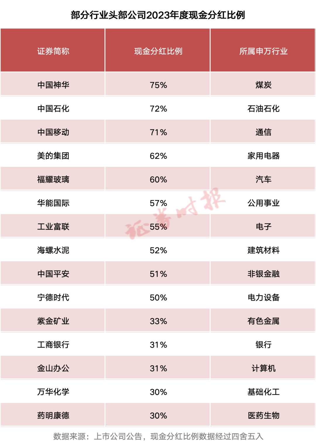 记者梳理发现,已披露2023年利润分配计划或方案的龙头公司现金分红总额占利润规模的比例普遍超过三成。除了上述公司外,在市值达千亿元级的公司中,包括福耀玻璃、华能国际、工业富联、海螺水泥、中国平安、中国海油、洛阳钼业、宝丰能源、中兴通讯、紫金矿业、金山办公等在内的行业龙头2023年度现金分红比例普遍超过30%,这里面,不少公司上述比例超过50%。