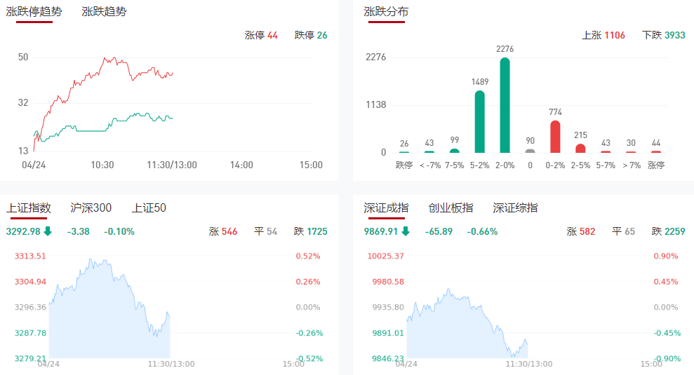 市场早盘震荡调整,创业板指领跌。沪深两市半日成交额7590亿,较上个交易日缩量91亿。盘面上热点较为杂乱,个股跌多涨少,全市场超4100只个股下跌。从板块来看,电力股再度走强,华银电力等涨停。宠物经济概念股一度冲高,中宠股份涨停。维生素概念股表现活跃,兄弟科技涨停。下跌方面,次新股集体大跌,港迪技术跌超10%。