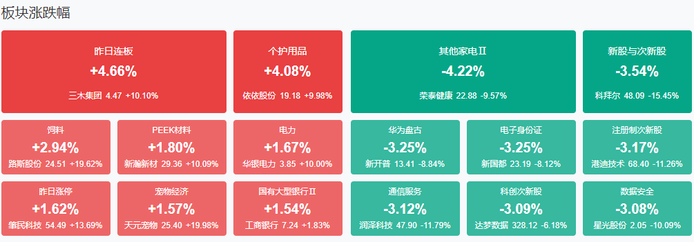 板块方面,电力、宠物经济、银行、维生素等板块涨幅居前,次新股、软件开发、量子科技、算力等板块跌幅居前。截至收盘,沪指跌0.1%,深成指跌0.66%,创业板指跌0.68%。