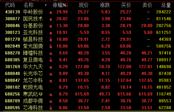 半导体板块大幅走高,截至收盘,国民技术20%涨停,台基股份涨超13%,紫光国微涨停,华大九天、长光华芯、龙芯中科、寒武纪等涨约9%。