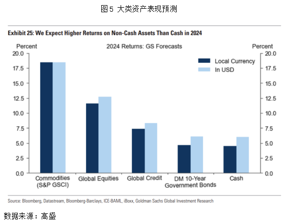 对于2024年的资本市场而言,情况可能相对复杂,但债券、股票及商品的表现可能会好于现金(短债)。2024年,全球经济有望摆脱2008年金融危机后“低通胀、零利率、负实际利率”的困境,全球多数经济体的政策利率和实际利率都将回到零以上,通缩风险将明显下降。而这意味着当前极具吸引力的现金(短债)的收益将会下滑,债券、原油等大宗商品以及股票都有机会跑赢现金资产。此外,由于美国经济的韧性持续存在,美元指数也将继续保持强势。