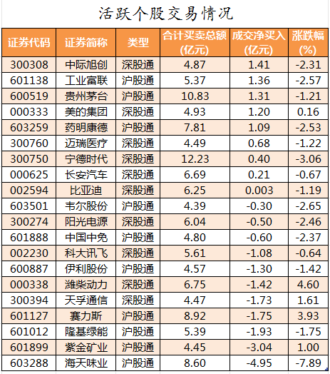 活跃个股方面,北向资金今日净买入较多的有中际旭创、工业富联、贵州茅台、美的集团、药明康德,净买入金额分别为1.41亿元、1.36亿元、1.31亿元、1.2亿元、1.09亿元。北向资金净卖出较多的有海天味业、紫金矿业、隆基绿能、赛力斯、天孚通信,净卖出金额分别为4.95亿元、3.04亿元、1.93亿元、1.75亿元、1.73亿元。