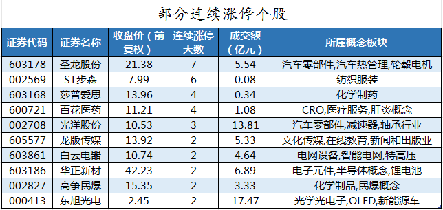 截至收盘,沪深两市合计1487个股上涨,3394只个股下跌,平盘个股182只,停牌的个股4只。不含当日上市新股,共有64只个股涨停,15只个股跌停。续涨停天数看,圣龙股份均已连收7个涨停板,连续涨停板数量最多。