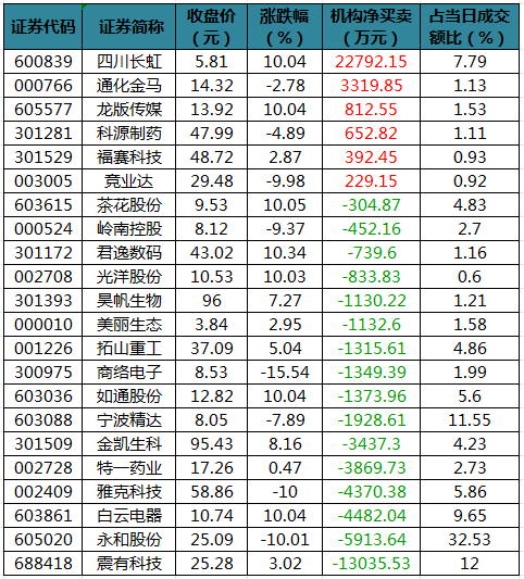 盘后龙虎榜数据显示,今日机构席位资金合计净卖出约1.75亿元。其中,净买入的个股6只,净卖出的个股16只。机构净买入最多的股票是四川长虹,净买入金额约2.28亿元;机构净买入居前的还有通化金马、龙版传媒等股。机构净卖出最多的股票是震有科技,净卖出金额约1.3亿元;机构净卖出居前的还有永和股份、白云电器、雅克科技等股。
