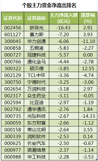 此外,3410只个股被主力资金净卖出,其中,74股被主力资金净卖出超1亿元。主力资金净流出最多的个股是欧菲光,净流出金额为16.43亿元;主力资金净流出居前的个股还有赛力斯、华力创通、五粮液、冠捷科技、通化金马,净流出金额分别为7.2亿元、6.06亿元、5.83亿元、5.57亿元、4.44亿元。