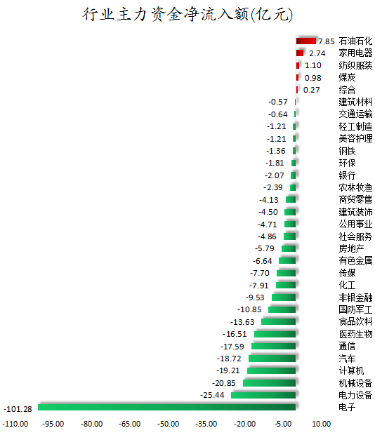 从行业板块来看,申万所属的31个一级行业,今日有5个行业板块主力资金呈现净流入,其中,石油石化行业板块主力资金净流入最多,净流入金额7.85亿元;行业板块主力资金净流入居前的还有家用电器、纺织服装,净流入金额分别为2.74亿元、1.1亿元。26个行业板块主力资金呈现净流出,其中,电子行业板块主力资金净流出最多,净流出金额为101.28亿元;行业板块主力资金净流出靠前的还有电力设备、机械设备、计算机、汽车、通信,净流出金额分别为25.44亿元、20.85亿元、19.21亿元、18.72亿元、17.59亿元。