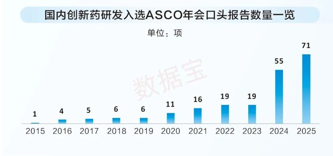 数据显示,2015年,中国入选ASCO年会的口头报告仅有一项,备受市场关注的最新突破性摘要(LBA)为0项。2025年,中国药企带着71项科研成果以口头报告形式亮相美国芝加哥ASCO年会,数量续创历史新高,最为重磅的LBA也多达11项。