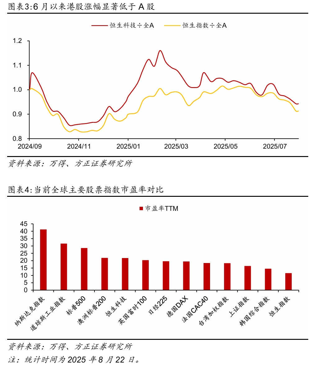 一是港股在估值上具备充分的吸引力。截至2025年8月22日,恒生指数的市盈率(TTM)为11.5x,大幅低于道琼斯工业指数(31.6x)、标普500(28.6x)、英国富时100(20.3x)、日经225(19.6x)等全球其他主要股票指数,恒生科技的估值(21.8x)也大幅低于纳斯达克指数(41.2x)(参见图表4)。